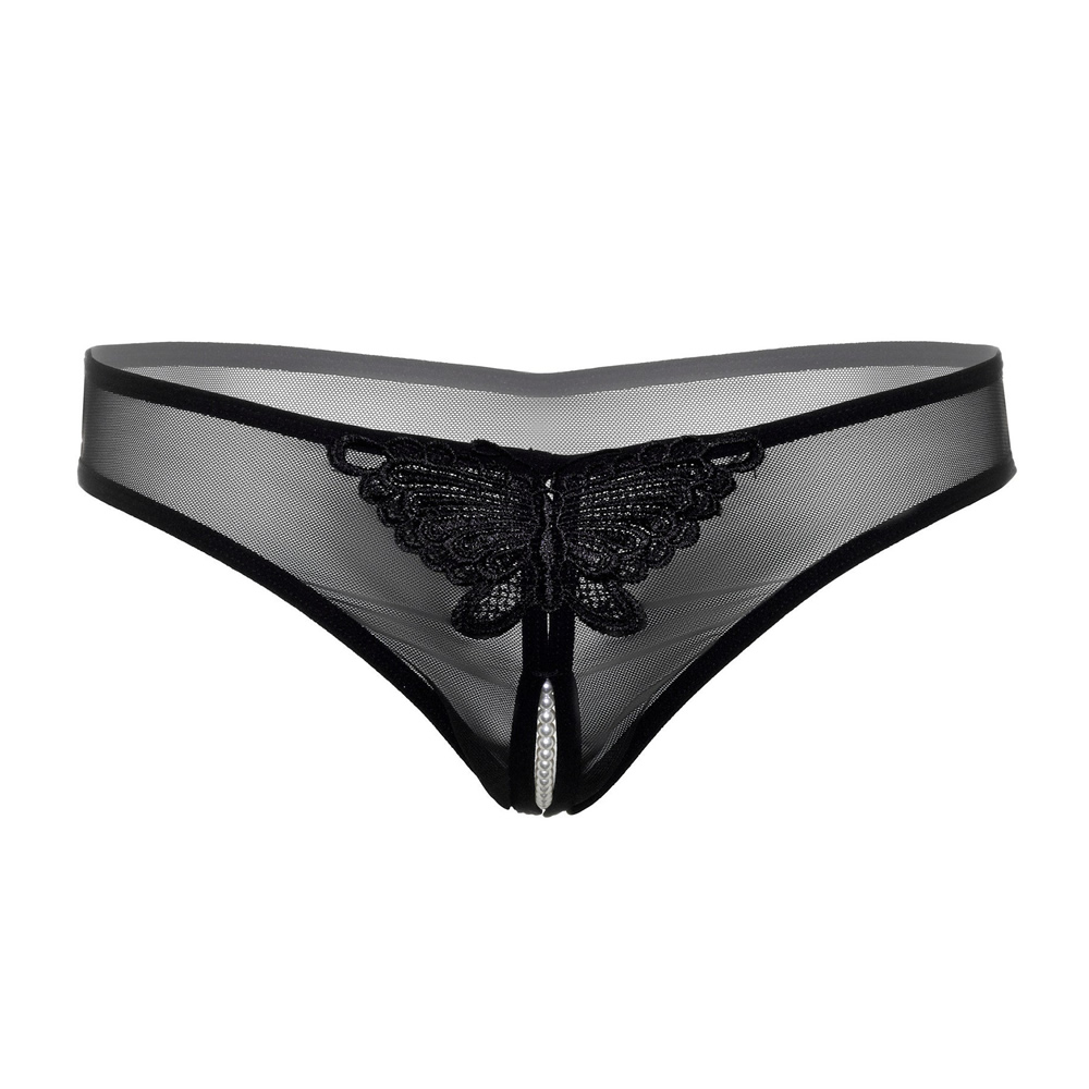 Prosojne tangice iz tila, z razporkom in umetnimi biseri v razkoraku. Z vezenino metulja.