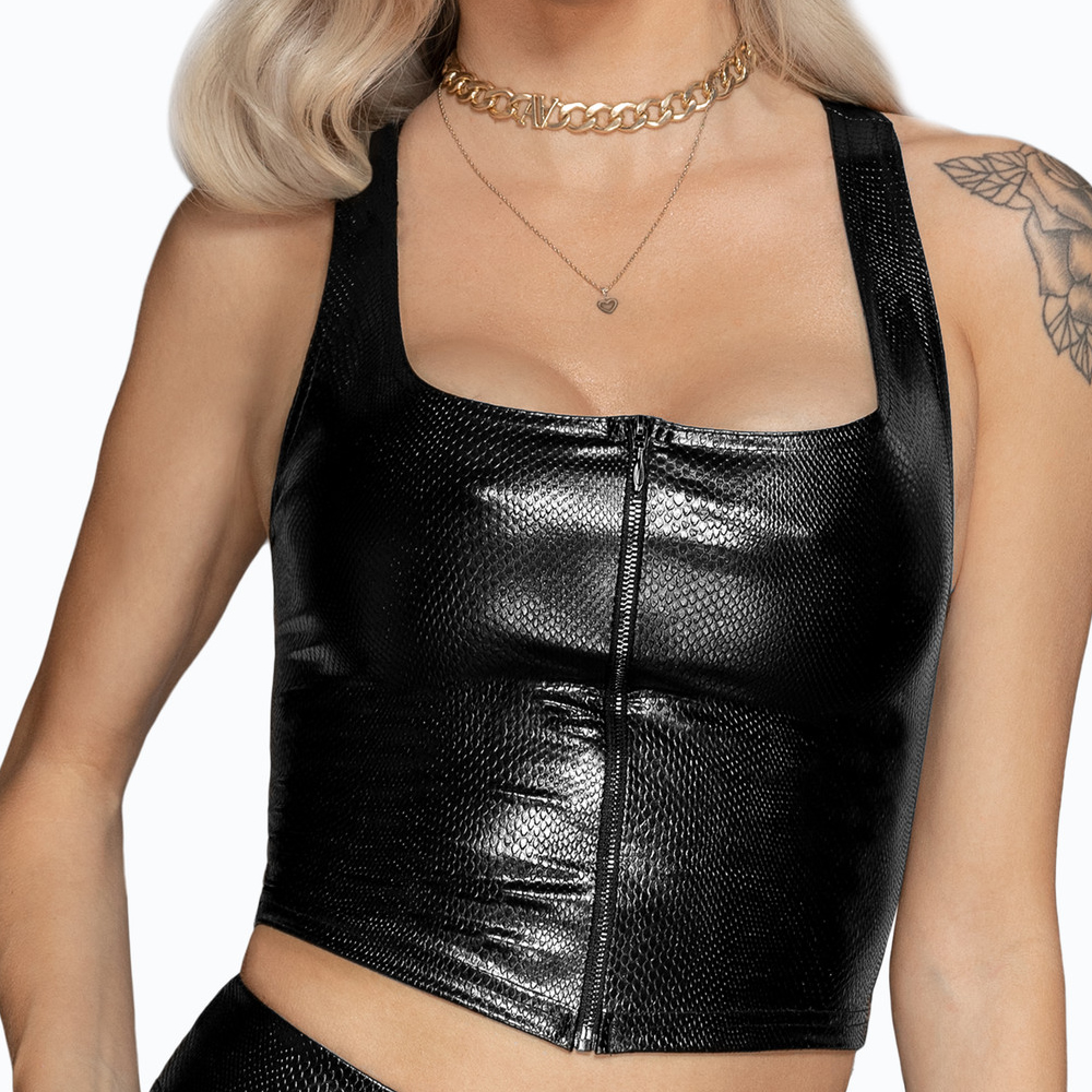 Eleganten vendar seksi wetlook top z zadrgo na sprednji strani. Seksi kos za vsako žensko garderobo.