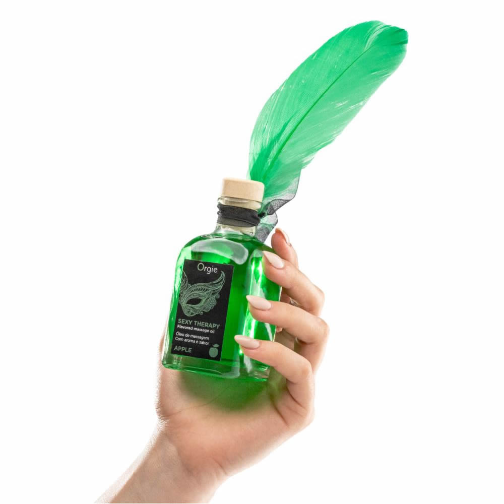 Komplet za masažo Sexy Therapy Kissable za masažo z ustnicami, vzburjajočo senzorično predigro. Komplet vsebuje 1 masažno olje Sexy Therapy Kissable z ogrevalnim učinkom in okusnim okusom jabolka, 1 pero in 1 vodnik za masažo z ustnicami.