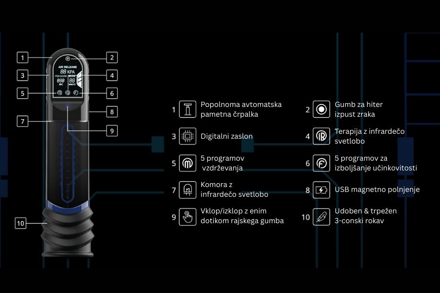 Avtomatska črpalka za izboljšanje zmogljivosti s tehnologijo infrardeče rdeče svetlobe, ki spodbuja rast z dodajanjem centimetrov in preprečuje degeneracijo penisa.