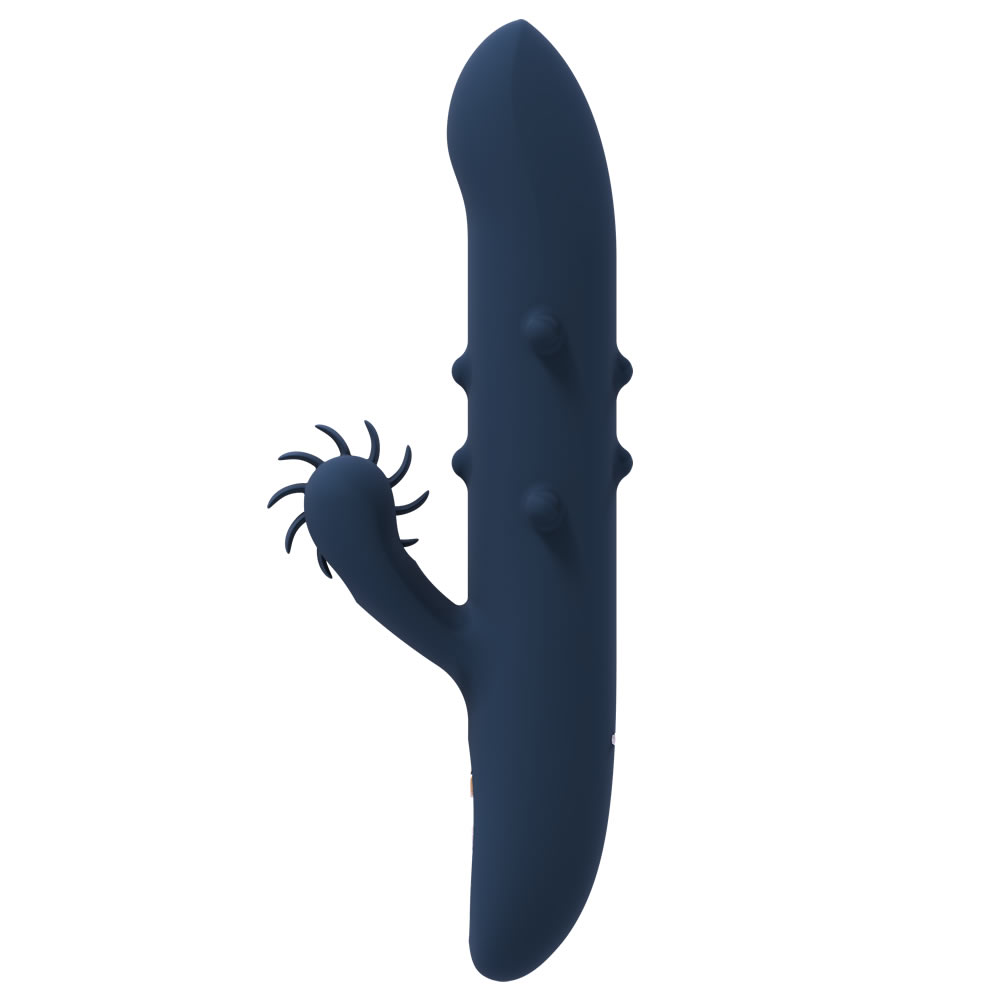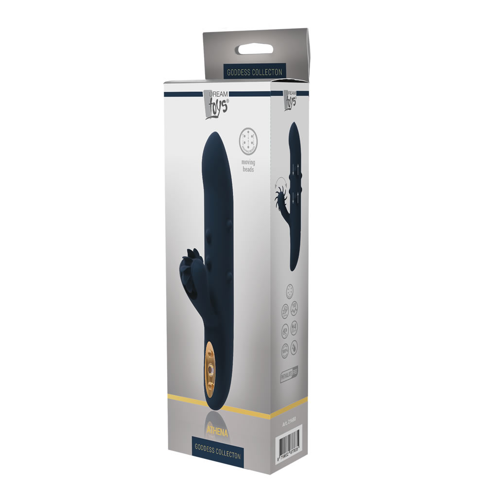 Ta vodotesen rabbit vibrator je izdelan iz telesu varnega “liquid” silikona, ki je zelo mehak na otip. Čuti se kot prava stvar. Stimulator klitorisa ni običajen vibrator, temveč vrteče kolesce z majhnimi jezički, ki imitirajo lizanje. 2 močna vibracijska motorja nudita 3 stopnje enakomernega vibriranja in 7 različnih ritmov. Še ena posebnost Athena vibratorja so gibajoče kroglice. V trupu vibratorja so namreč kroglice, ki sledijo gibanju vibracij.