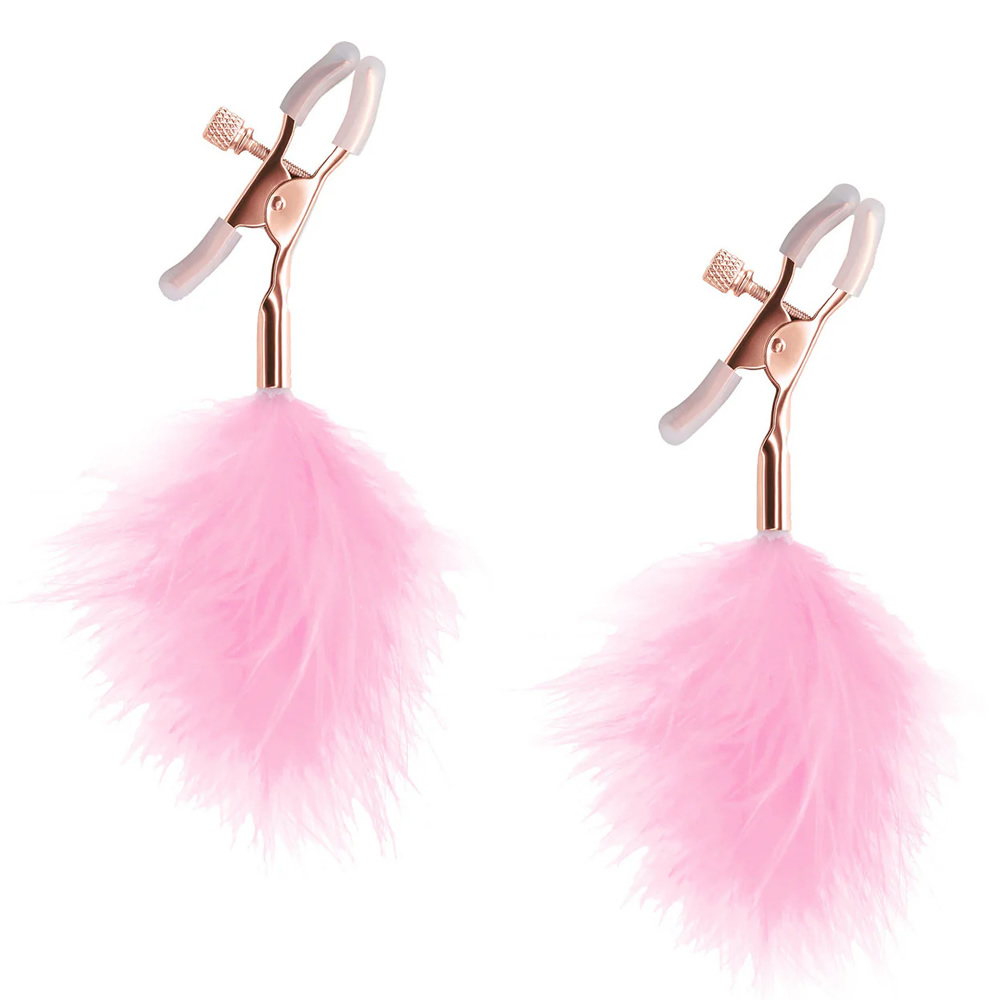 Par ščipalk za bradavice, s prilagodljivim stiskom, z obeskom iz roza obarvanega perja.